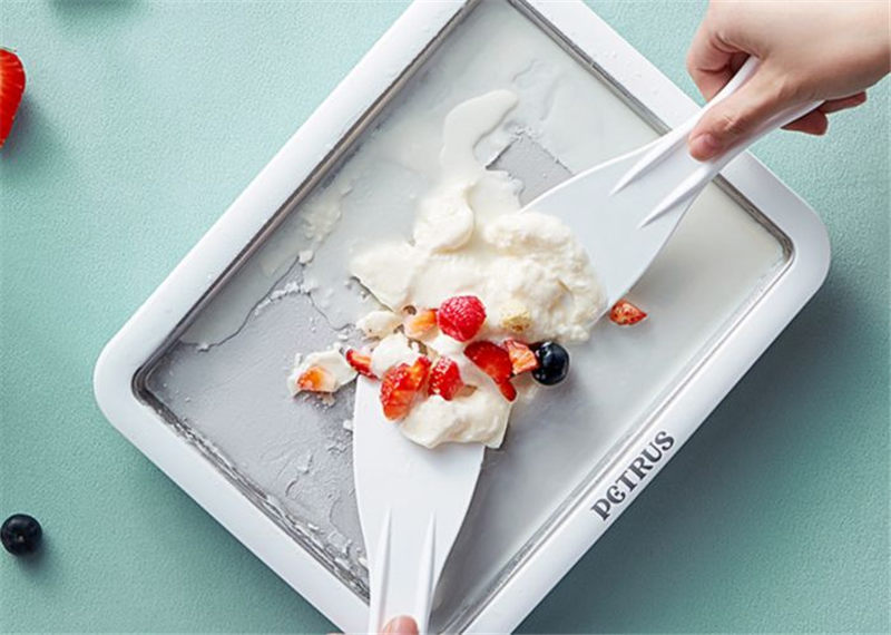 每次经过炒酸奶摊都发现有不少人驻足观望,液体在炒冰机的神奇作用下变成固体的过程看着十分有趣,炒酸奶的口感也更有层次,酸酸甜甜还伴有浓郁的果香,是时候给厨房安排上这款柏翠家用炒冰机PET035,无需外出宅家就可以吃上冰凉爽口的炒酸奶了,这款制作台采用304食品级不锈钢,搭配加量的环保冷冻液,冰力强劲促进冰淇淋快速凝冻成型,大面积台面一次可以制作约4个冰淇淋球的份量,现做现吃,好吃又有趣。