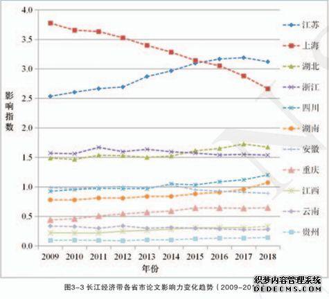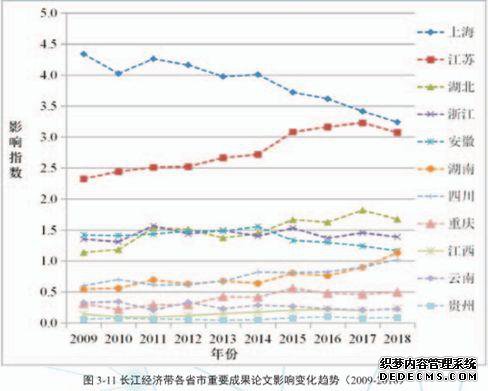 同时,长江经济带各省市竞争激烈,在发文量与/或影响上,江苏超越了上海,湖北超越了浙江,湖南超越了安徽,江西超越了云南。几位可以说是长江江畔的“科研杨超越”了。