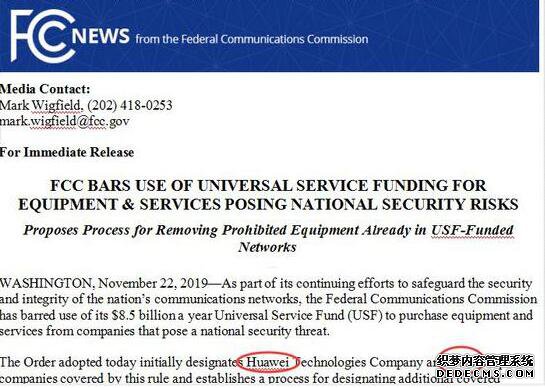 该禁令显示,禁止从相关公司购买设备和服务的规定在《联邦公报》上公布后立即生效,该文件已经获得FCC主席等批准和发表申明。