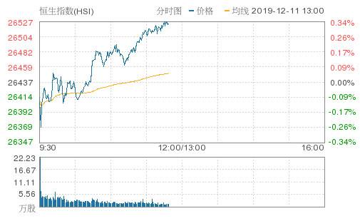 恒指今早低位回升,早盘低开0.1%报26410点,开盘后曾跌超70点,低见26364点。随后恒指跌幅持续收窄并翻红,盘中最高涨逾90点,高见26530点。
