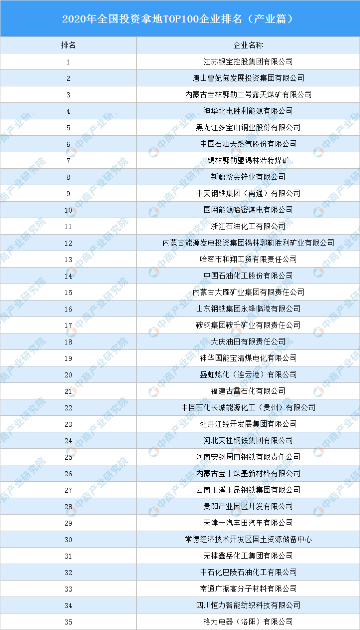 据中商产业研究院产业地产情报库监测数据显示:2020年1-12月全国投资拿地TOP100企业排行榜已揭晓。榜单显示,2020年我国投资拿地前十企业分别为:江苏银宝控股集团有限公司、唐山曹妃甸发展投资集团有限公司、内蒙古吉林郭勒二号露天煤矿有限公司、神华北电胜利能源有限公司、黑龙江多宝山铜业股份有限公司、中国石油天然气股份有限公司、锡林郭勒盟锡林浩特煤矿、新疆紫金锌业有限公司、中天钢铁集团(南通)有限公司、国网能源哈密煤电有限公司。