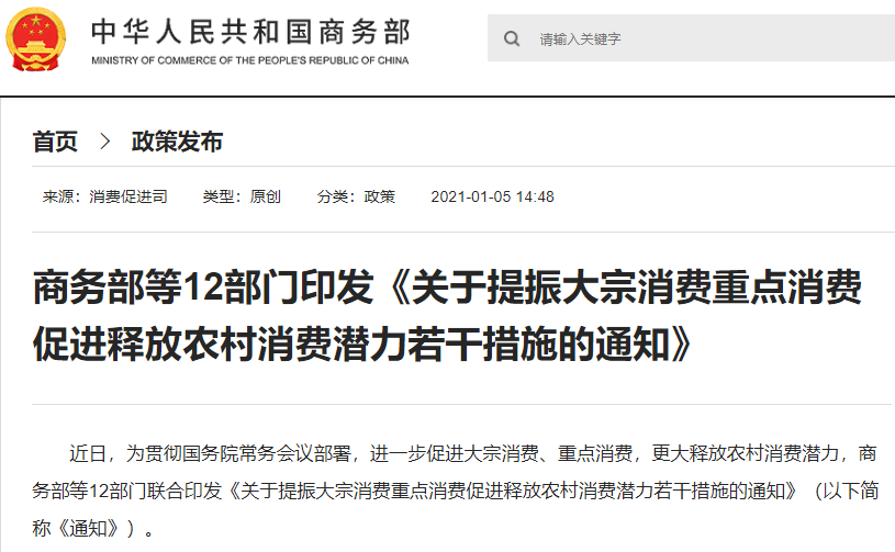今年1月5日,商务部等12部门联合印发《关于提振大宗消费重点消费促进释放农村消费潜力若干措施的通知》(以下简称《通知》)。《通知》提出五个方面工作任务: