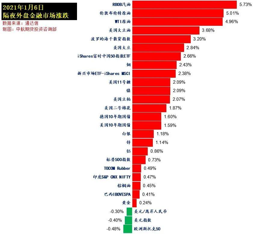 受此消息影响,国际油价大涨,WTI原油期货一度突破50美元关口,为去年2月以来首次。截至今日凌晨收盘,美股标普500指数涨0.71%,欧洲Stoxx50指数跌0.57%,美元指数跌0.45%,WTI原油涨5.17%,Brent原油涨5.60%,伦铜涨2.48%,黄金涨0.36%,美豆涨2.86%,美豆粕涨2.24%,美豆油涨3.73%,美糖涨2.09%,美棉涨1.73%,CRB指数涨2.58%,BDI指数涨3.20%。