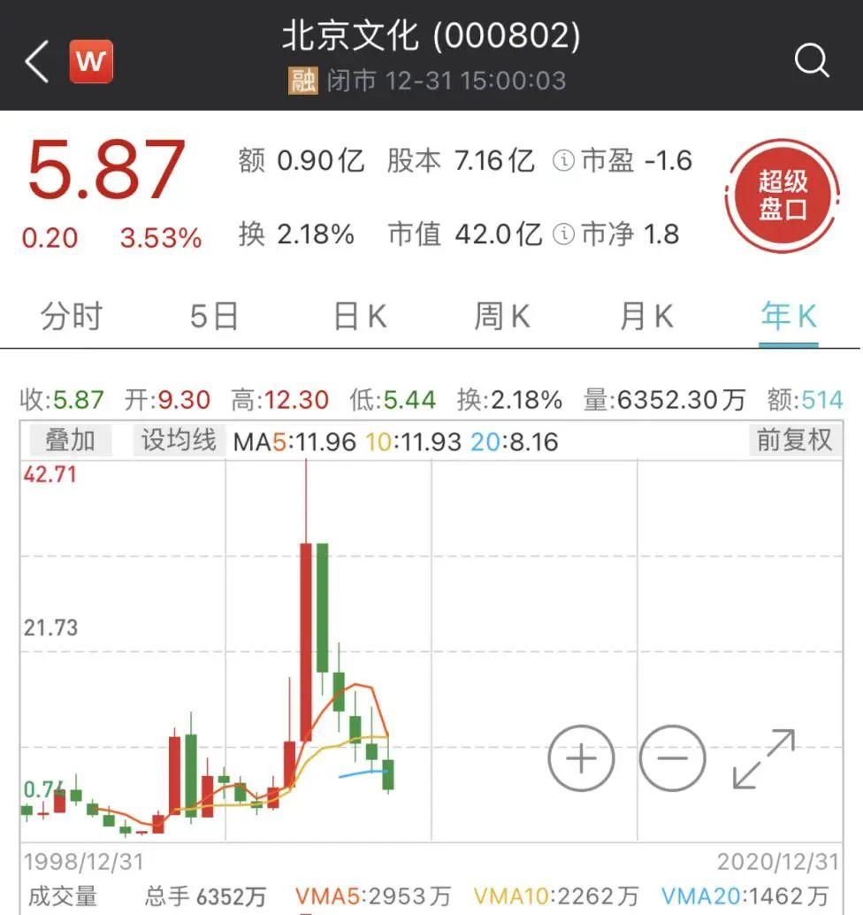 北京文化股价最高曾突破40元/股,截至12月31日,股价已从历史最高点跌去85%,报收5.87元/股。