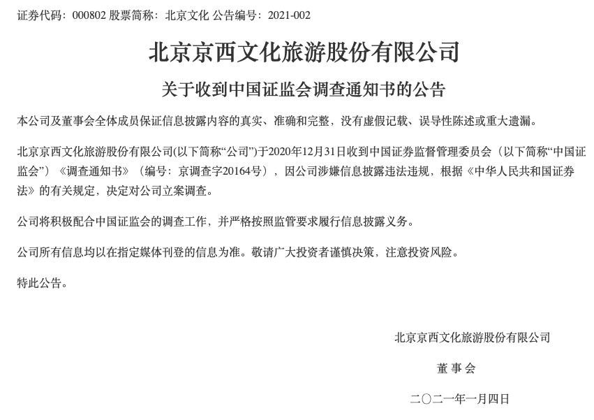 1月3日晚间,北京文化(000802)发布公告称,公司于2020年12月31日收到中国证监会《调查通知书》,因公司涉嫌信息披露违法违规,根据《中华人民共和国证券法》的有关规定,决定对公司立案调查。