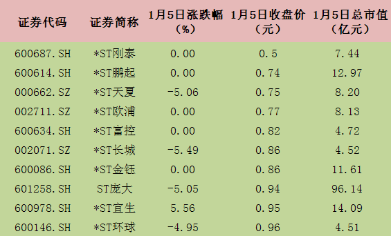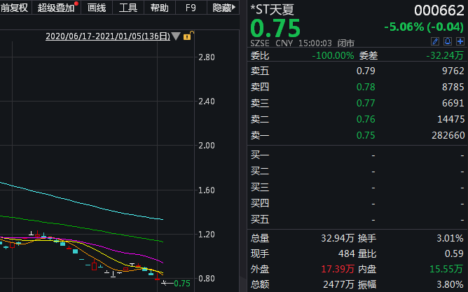 目前,新规下首只1元退市股或已有归属。Wind数据显示,截至1月5日收盘,沪深两市共有10只个股股价低于1元。*ST天夏(000662.SZ)最有可能成为退市新规下的首只1元退市股。截至收盘,公司股价跌停报0.75元,已连续14个交易日股价低于1元。这意味着,若*ST天夏下一个交易日无法涨停,将在连续20个交易日里股价均低于1元,成为2021年首只1元退市股。