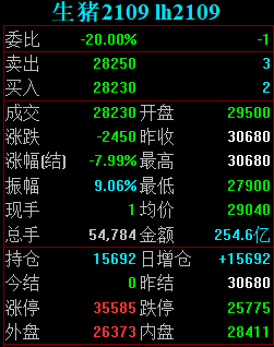 1月8日,生猪期货在大连商品交易所正式挂牌上市。主力合约跳水不断,盘中一度跌超8%,现跌7.99%,报28230元/吨。
