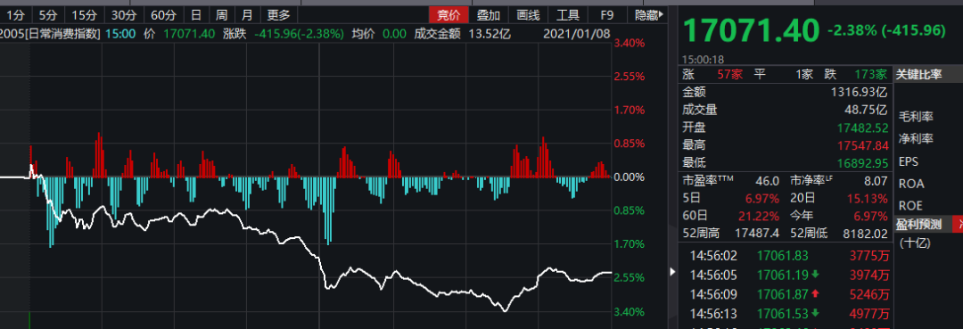 但今天,白酒为首的消费板块栽了。白酒板块单日蒸发1700亿元,五粮液一度跌超6%,茅台一度杀跌超3%。其中,五粮液1月7日晚间发布2020年度主要业绩数据。公司称,2020年,五粮液实现营收572亿元左右,同比增长14%左右;实现归属于上市公司股东的净利润199亿元左右,同比增长14%左右。这份业绩尚属不俗。