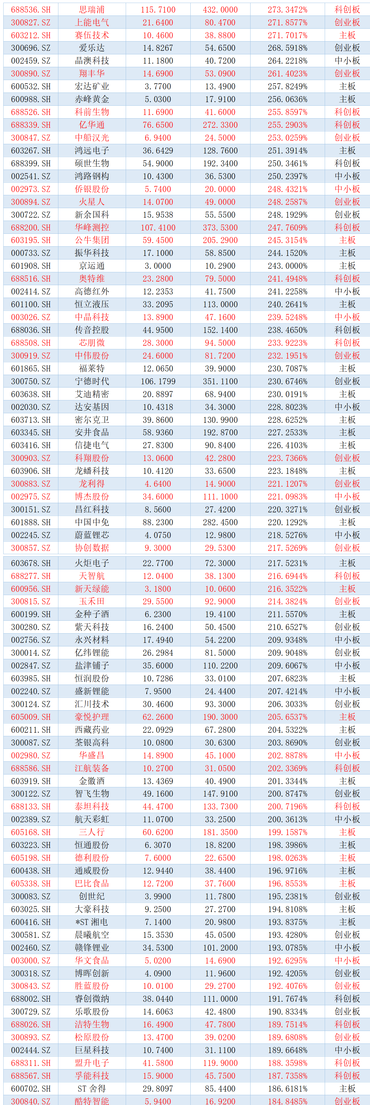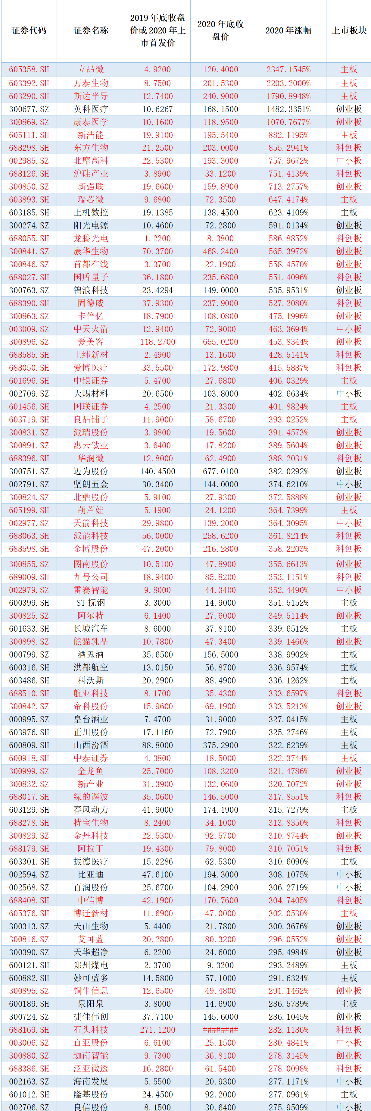 牛年第一个交易日可谓延续了2020年的强势行情,尤其是部分个股的表现堪称抢眼。刚刚过去的2020年,哪些个股实现了股价的强势翻倍乃至涨幅超5倍、10倍?时代商学院基于个股2019年底收盘价(前复权)、2020年底收盘价(前复权),统计A股4000多只个股在2020年全年的涨跌幅(若是2020年新股,则计算基准为该股上市首发价)。统计结果显示,合计有436只个股2020年涨幅翻倍,其中5只涨幅超10倍,19只超5倍。具体榜单如下(标红个股为2020年新股)。