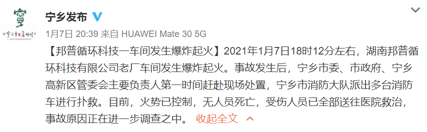 1月7日晚20:39,官方微博“宁乡发布”通报,7日18时12分左右,湖南邦普老厂车间发生爆炸起火。