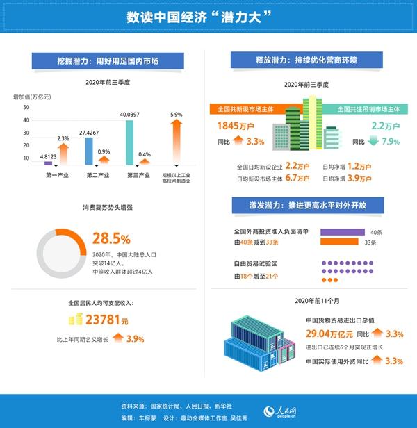 在逆境中“破局”,彰显出中国经济强大的抗风险能力和深厚的底蕴。而坚持挖掘潜力、释放潜力、激发潜力,正是2020年中国经济取得历史性成就的关键支撑。