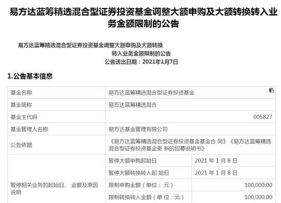 除此之外,不少绩优老基金也在近期开始“限购”。比如,明星基金经理张坤管理的易方达蓝筹精选混合基金在今年1月7日发布公告,将单日单个基金账户累计申购限额由此前的100万元调整为10万元。