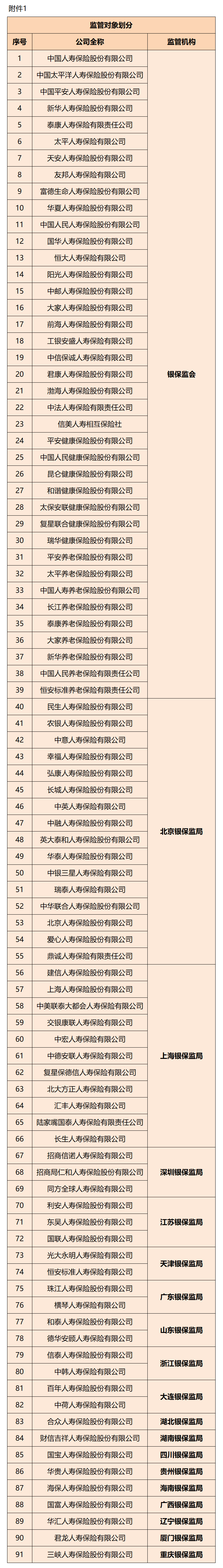 人身保险公司划分为银保监会直接监管和银保监局属地监管两类。其中,银保监会直接监管公司39家,银保监局属地监管公司52家。(详见附件1)
