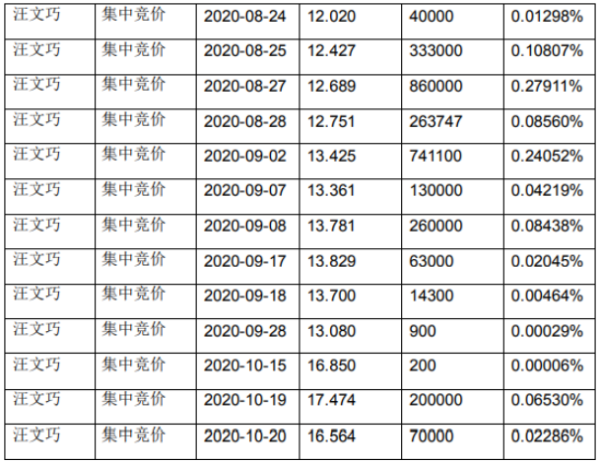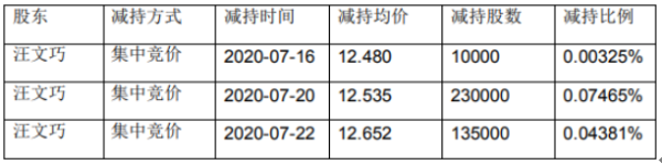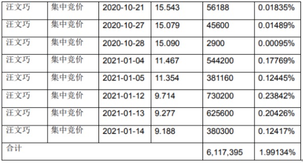 截至本公告日,股东汪文巧在深圳证券交易所通过竞价交易方式完成611.74万股的减持,权益变动前汪文巧持股10.17%,权益变动后持股比例为8.24%。