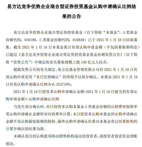 1月19日下午,易方达基金发布公告宣布,1月18日发售的爆款基金——易方达竞争优势企业有效认购申请确认比例为6.253716%。