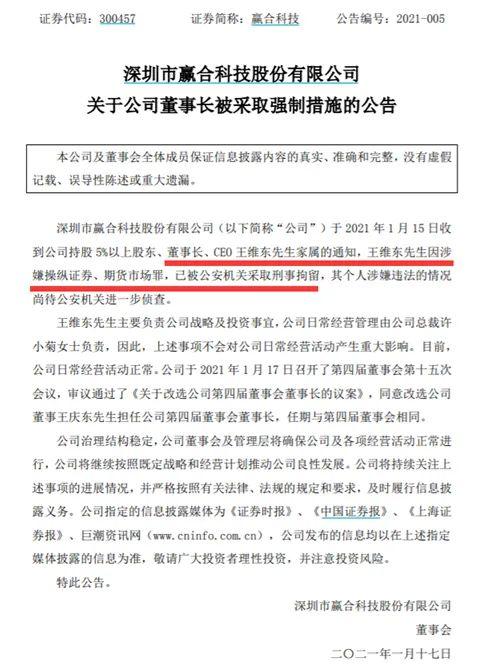 公告提到,公司于2021年1月15日收到公司持股5%以上股东、董事长、CEO王维东先生家属的通知,王维东先生因涉嫌操纵证券、期货市场罪,已被公安机关采取刑事拘留,其个人涉嫌违法的情况尚待公安机关进一步侦查。