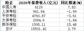 中国人寿、人保寿险、平安寿险、太保寿险和新华保险2020年累计实现原保险保费收入1.55万亿元,同比增幅为2.79%。