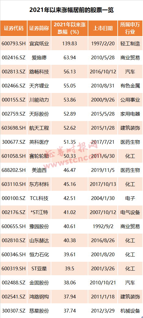 统计数据显示,在剔除最近半年上市的次新股后,2021年以来涨幅最大的股票就是宜宾纸业,累计涨幅高达139.83%,远超排在其后的爱施德、路畅科技等的涨幅。