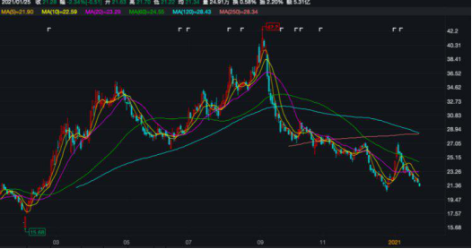 从2020年9月2日触及42.2元/股高点,至2021年1月25日收于21.35元/股,新希望六和股份有限公司(下称新希望,000876.SZ)这一波股价下跌已延续5个月之久。其间虽有过短暂回温,但下行趋势仍为主流。前述区间内,新希望股价跌幅高达49.4%。