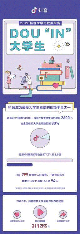 1月26日,抖音发布《2020抖音大学生数据报告》(以下简称《报告》)。《报告》显示,截至2020年12月31日,抖音在校大学生用户数已超2600万,占全国在校大学生总数的近80%。同时,北京大学、清华大学、中国人民大学等94所“985”、“211”高校,均已在抖音开通了官方账号,展现校园风貌。
