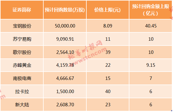 其中,计划回购金额超过10亿元的上市公司有宝钢股份、苏宁易购、歌尔股份3家。宝钢股份回购金额最多, 1月20日,宝钢股份披露回购公司A股股份方案,公司拟用不超过人民币40亿元的自有资金,以不超过人民币8.09元/股的价格回购公司A股股份,回购股份数量不低于4亿股,不超过5亿股,占公司回购前总股本约1