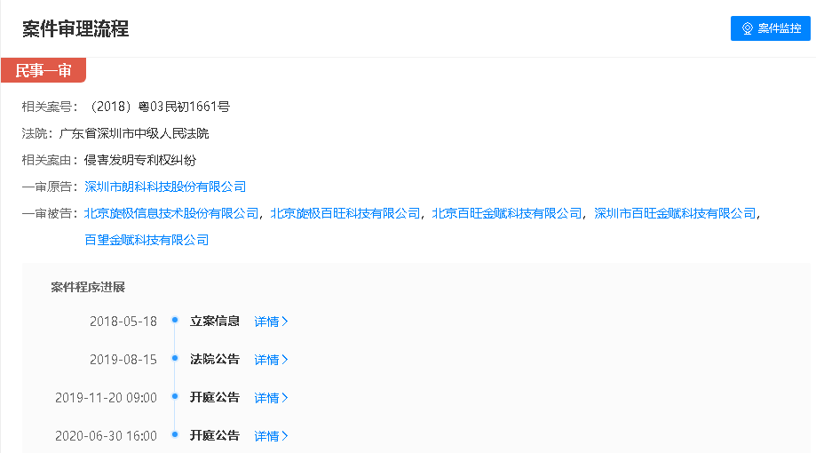 天眼查显示,微众信科实控人孙淏添本人的自身风险尚显示为0,周边风险则有10条。例如,其中有由微众信科招控股股东中润四方控制的深圳市百旺金赋科技有限公司被起诉的相关开庭信息。该案开庭时间为2020年6月30日,案由为侵害发明专利权纠纷,原告为深圳市朗科科技股份有限公司,被告为北京旋极信息技术股份有限公司、北京旋极百旺科技有限公司、百望金赋科技有限公司、深圳市百旺金赋科技有限公司、北京百旺金赋科技有限公司。