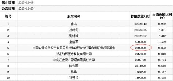 截至2020年12月18日,中国农业银行股份有限公司-新华优选分红混合型证券投资基金为该股第5大流动股股东,持股数量为280.00万股,持股比例0.822%。