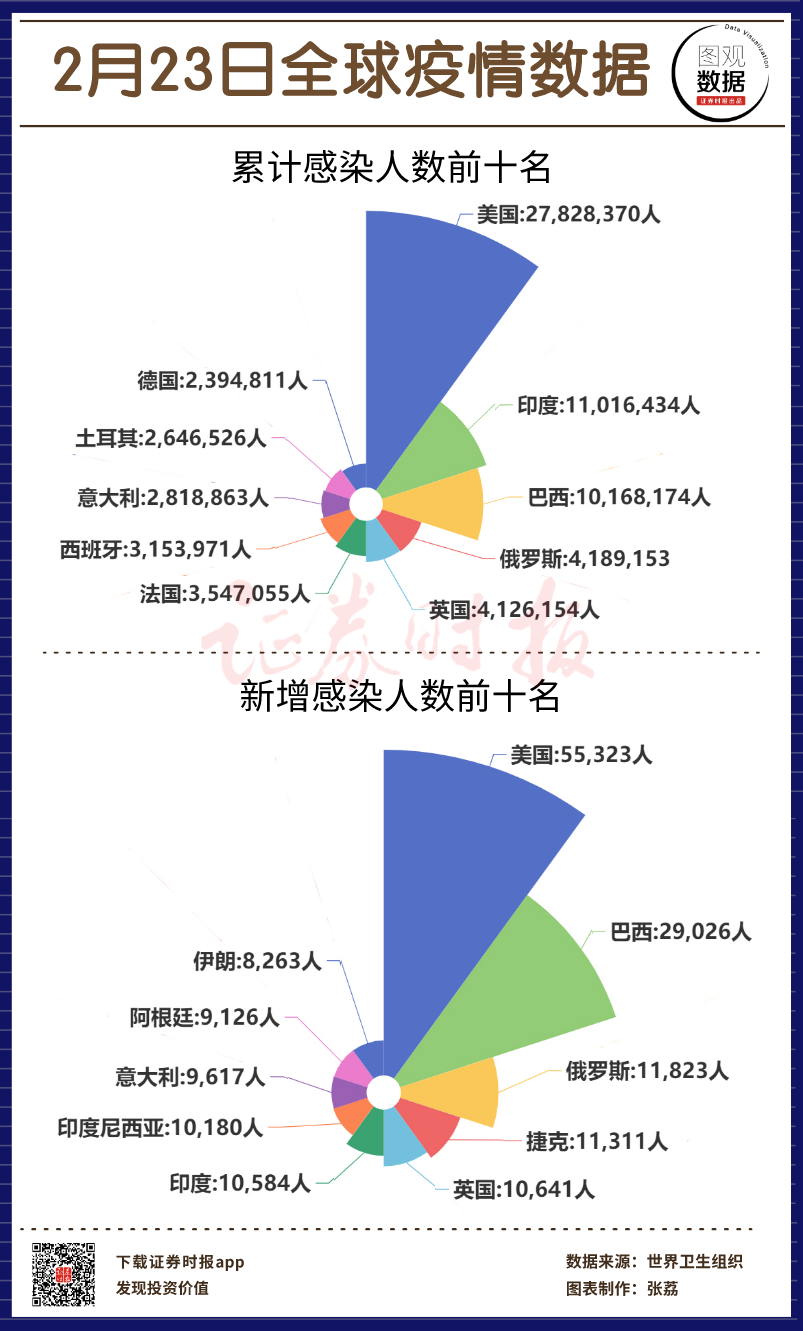 据世界卫生组织数据,截止2月23日,全球新冠累计感染111,419,939人。其中美国累计感染27,828,370人,2月23日新增55,323人。印度累计感染11,016,434人。2月23日巴西新增感染29,026人,俄罗斯新增感染11,823人。
