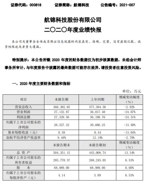 挖贝网2月23日,航锦科技(000818)发布2020年度业绩快报公告,公告显示,2020年1-12月营业总收入为366,392.65万元,比上年同期减少2.92%;归属于上市公司股东的净利润为26,527.32万元,比上年同期减少13.50%。