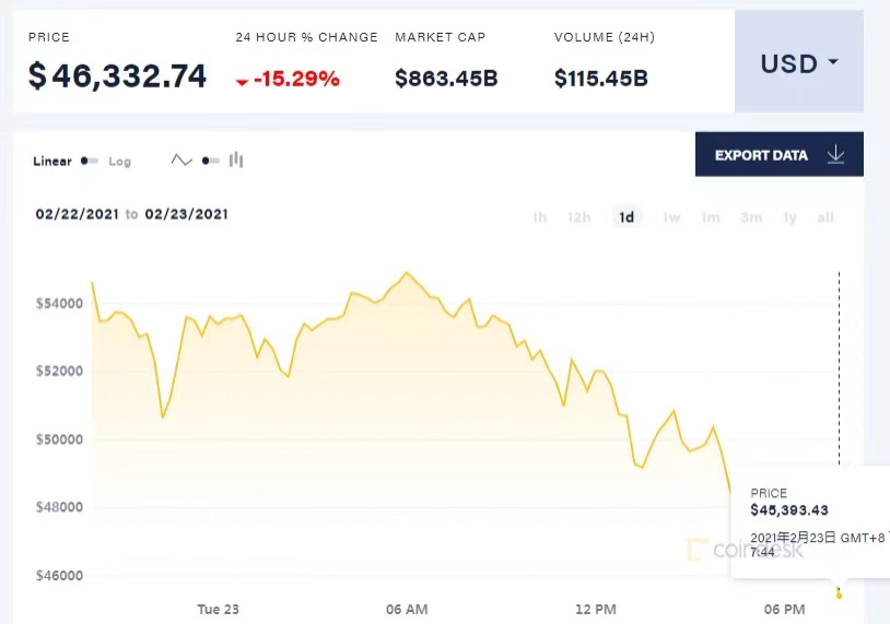 Coindesk数据显示,截至2021年2月23日19时44分,比特币报45393.43美元。