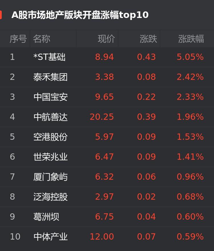 A股房企股板块开盘涨幅位居前十位的是,*ST基础涨幅5.05%,泰禾集团涨幅2.42%,中国宝安涨幅2.33%,中航善达涨幅1.96%,空港股份涨幅1.53%,世荣兆业涨幅1.41%,厦门象屿涨幅0.96%,泛海控股涨幅0.68%,葛洲坝涨幅0.60%,中体产业涨幅0.59%。