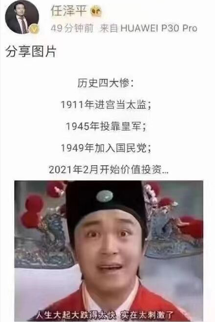 就连著名经济学家任泽平都开始发段子:2021年2月开始价值投资,好比1911年进宫当太监!