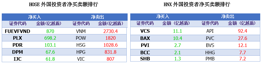 外资继续保持净流出态势,两市净卖出总额达1.15913万亿越盾(约3.2698人民币),其中卖盘主要来自VNM(2730.9亿越盾≈7704万人民币),POW(1818.2亿越盾≈5129万人民币)和HSG(1029.2亿越盾≈2903万人民币)。