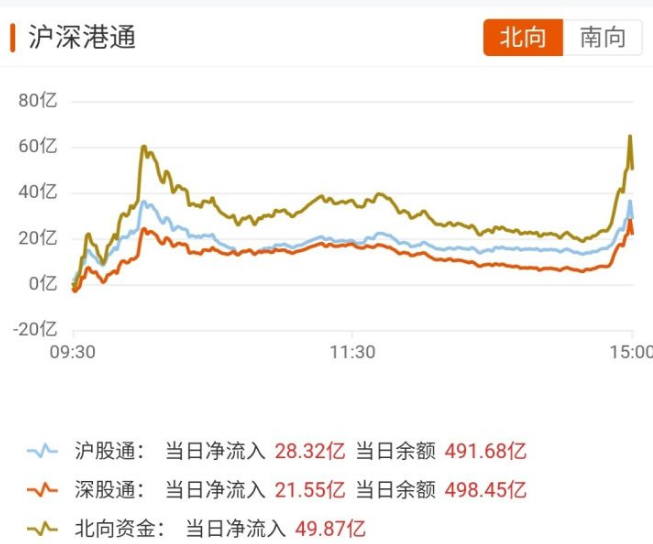 具体而言,全天净流入了49.87亿,其中沪股通净流入了28.32亿,深股通净流入了21.55亿。