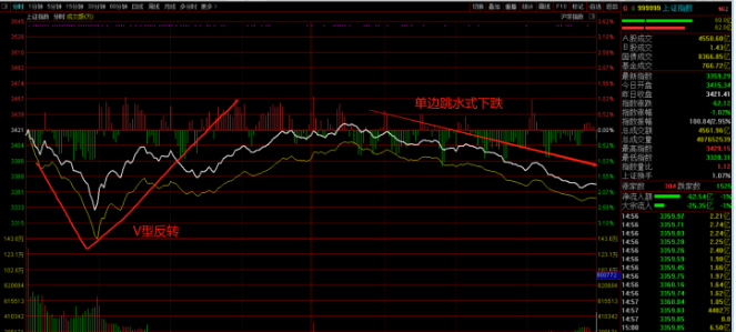 早盘,承接昨天下跌惯性低开,在A50带领下,沪指快速下跌超过90个点,随后展开技术性反弹,主要股指在上午收盘前后先后翻红,上半时段出现巨“V”反转。但是翻红仅仅持续了几分钟,午后再次出现“跳水”走势,和昨天的走势高度类似。