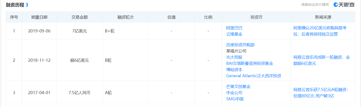 天眼查显示,网易云音乐成立于2016年,目前完成了B+轮融资,交易金额7亿美元。