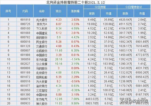北向资金实现连续5日净流入,回顾上一个交易日增持股数最多的前十只股票分别是光大银行(-4820.54万)、京东方A(-4511.52万)、TCL科技(-4104.01万)、中国建筑(-3817.78万)、 新钢股份(-2643.42万)、 民生银行(-1692.34万)、交通银行(-1626.17万)、云铝股份(-1603.11万)、 中国银行(-1450.48万)、东方财富(-1392.42万),另外有50股获得北向资金连续5日增持,其中具体累计增持买入额排名前五的有通威股份、中天科技、沪电股份、海螺水泥、中国太保。