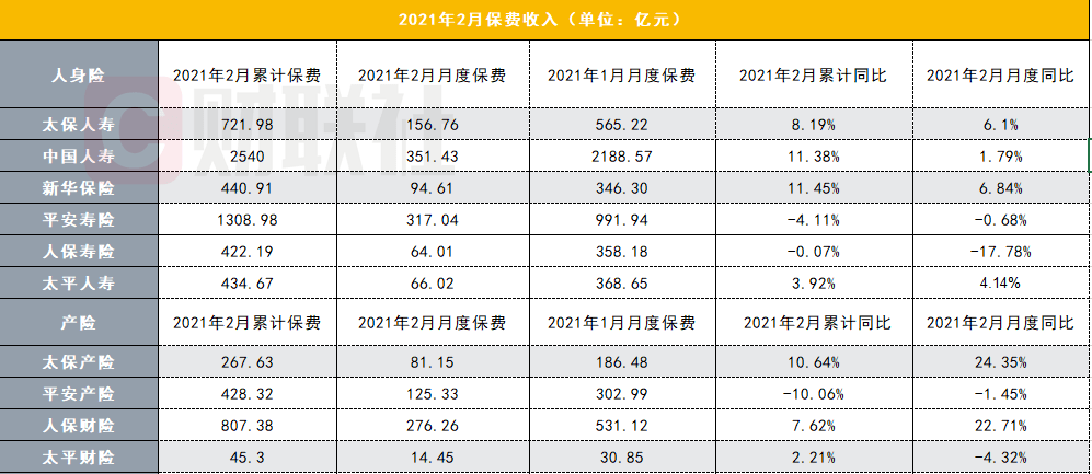 数据显示,2021年前两个月,新华保险、中国人寿、太保人寿、太平人寿累计保费分别同比增长了11.45%、11.38%、8.19%、3.92%;其中2月单月保费来看,太保人寿和新华保险增速领先,分别达到6.84%和6.1%,中国人寿同比增长1.79%,太平人寿同比增长4.14%。