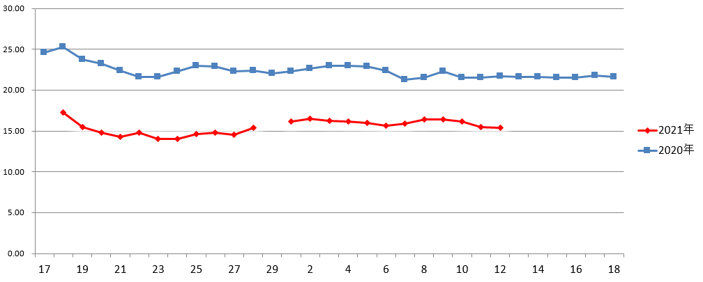 2021年2月末至3月初与上年同期白条猪平均价走势对比图