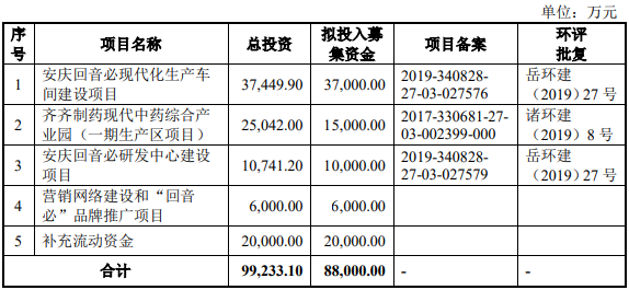 回音必原拟在深交所创业板公开发行不超过1.00亿股,本次发行不涉及股东公开发售的情形。回音必原拟募集资金8.80亿元,其中3.70亿元用于安庆回音必现代化生产车间建设项目,1.50亿元用于齐齐制药现代中药综合产业园(一期生产区项目),1.00亿元用于安庆回音必研发中心建设项目,6000.00万元用于营销网络建设和“回音必”品牌推广项目,2.00亿元用于补充流动资金。