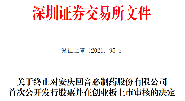 2021年3月15日,回音必向深交所提交了《安庆回音必制药股份有限公司关于撤回首次公开发行股票并在创业板上市申请文件的申请》,保荐人国盛证券向深交所提交了《关于撤回安庆回音必制药股份有限公司首次公开发行股票并在创业板上市申请文件的申请》。根据《深圳证券交易所创业板股票发行上市审核规则》第六十七条的有关规定,深交所决定终止对回音必首次公开发行股票并在创业板上市的审核。