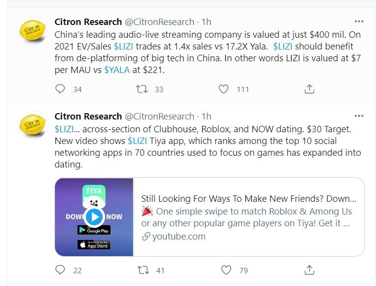 3月16日,香橼研究(Citron Research)在推特称,荔枝的目标价格应该是30美元。香橼分析道,荔枝是中国领先的音频直播公司,但仅仅价值4亿美元。荔枝的2021年市值与销售额之比为1.4倍,相比之下Yala为17.2倍。荔枝应该能从中国大型科技公司的反垄断中受益。也就是说,荔枝每个月度活跃用户(MAU)仅价值7美元,而Yala则价值221美元。