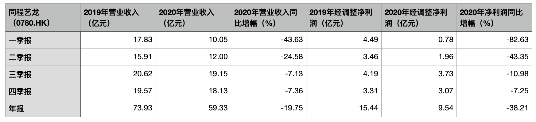3月23日,同程艺龙控股有限公司(同程艺龙,00780.HK)发布了截至2020年12月31日的全年业绩报告。财报显示,2020年同程艺龙实现营业收入59.33亿元(人民币,下同),同比减少19.8%;净利润9.54亿元,2019年同期净利润为15.44亿元;经调整EBITDA(息税折旧及摊销前利润)约13.66亿元。