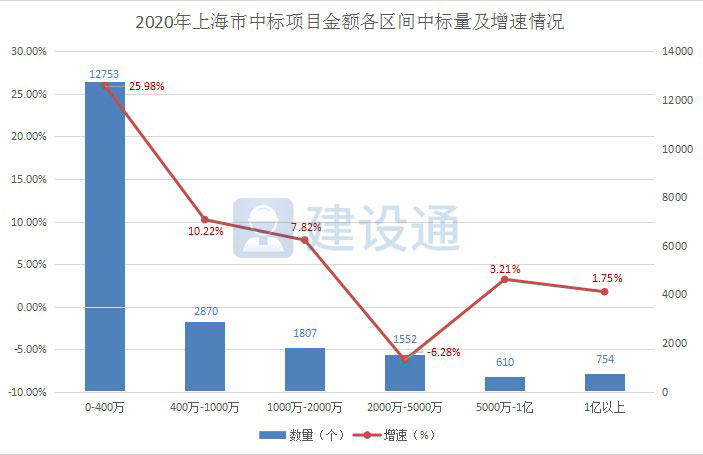 中标项目金额主要集中在400万以下。2020年上海施工企业,中标金额在400万以下的项目个数有12753个,较上年同比增长25.98%;中标项目金额在400-1000万的项目个数有2870个,较上年同比增长10.22%;1000万-2000万的项目个数有1807个,较上年同比增长7.82%;2000万-5000万的项目个数有1552个,较上年同比降低6.28%;5000万-1亿的项目个数有610个,较上年同比增长3.21%;1亿以上的项目个数有754个,较上年同比增长1.75%。