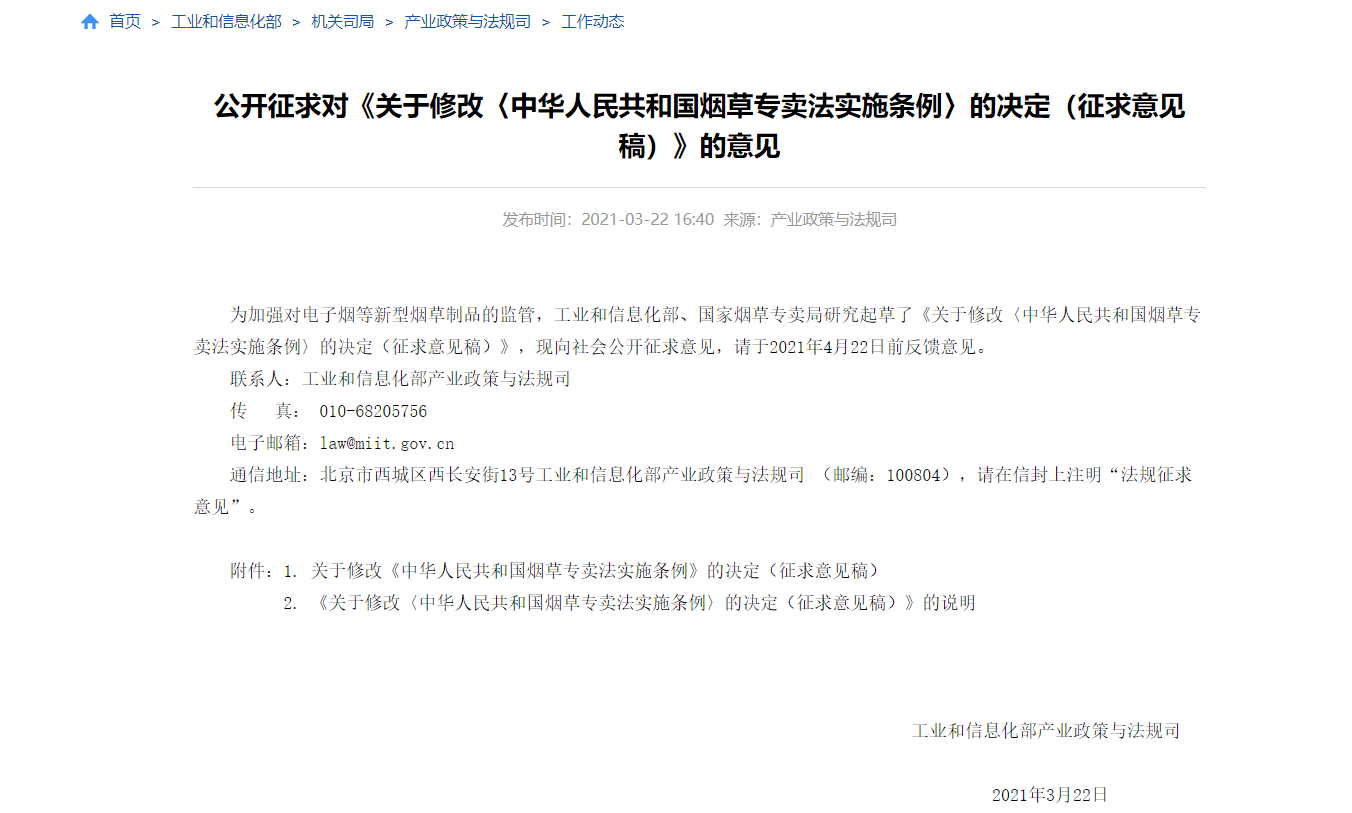 3月23日,资本邦了解到,近日工信部发布公开征求对《关于修改〈中华人民共和国烟草专卖法实施条例〉的决定(征求意见稿)》的意见。在《中华人民共和国烟草专卖法实施条例》附则中增加一条,作为第六十五条:“电子烟等新型烟草制品参照本条例中关于卷烟的有关规定执行。”