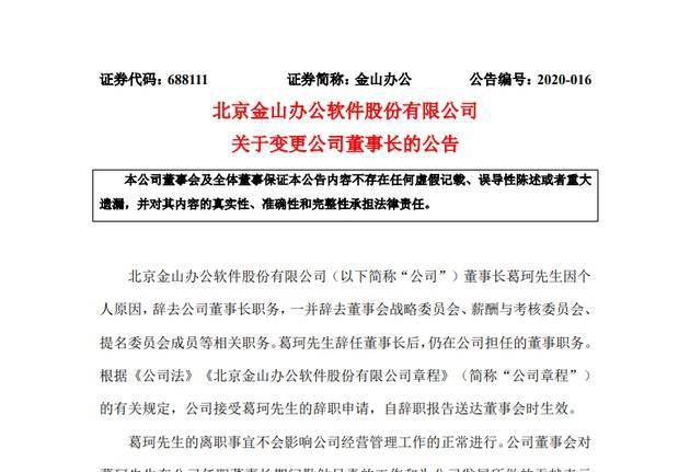 北京金山办公软件股份有限公司(以下简称 “公司”)董事长葛珂先生因个人原因,辞去公司董事长职务,一并辞去董事会战略委员会、薪酬与考核委员会、提名委员会成员等相关职务。葛珂先生辞任董事长后,仍在公司担任的董事职务。根据《公司法》《北京金山办公软件股份有限公司章程》(简称 “公司章程”)的有关规定,公司接受葛珂先生的辞职申请,自辞职报告送达董事会时生效。