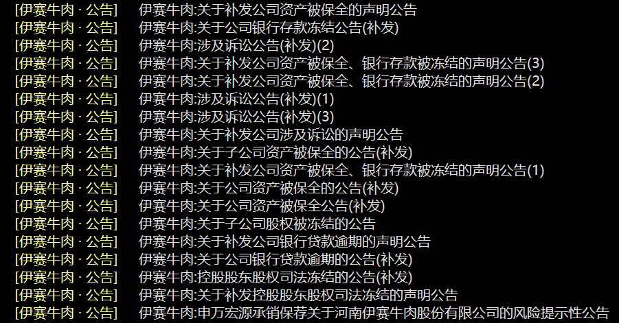 3月24日,资本邦了解到,伊赛牛肉(832910.OC)近日集中补发了一批涉及公司风险的公告,其中包括控股股东股权司法冻结、银行贷款逾期、子公司资产被保全、涉及诉讼、公司银行存款冻结等。