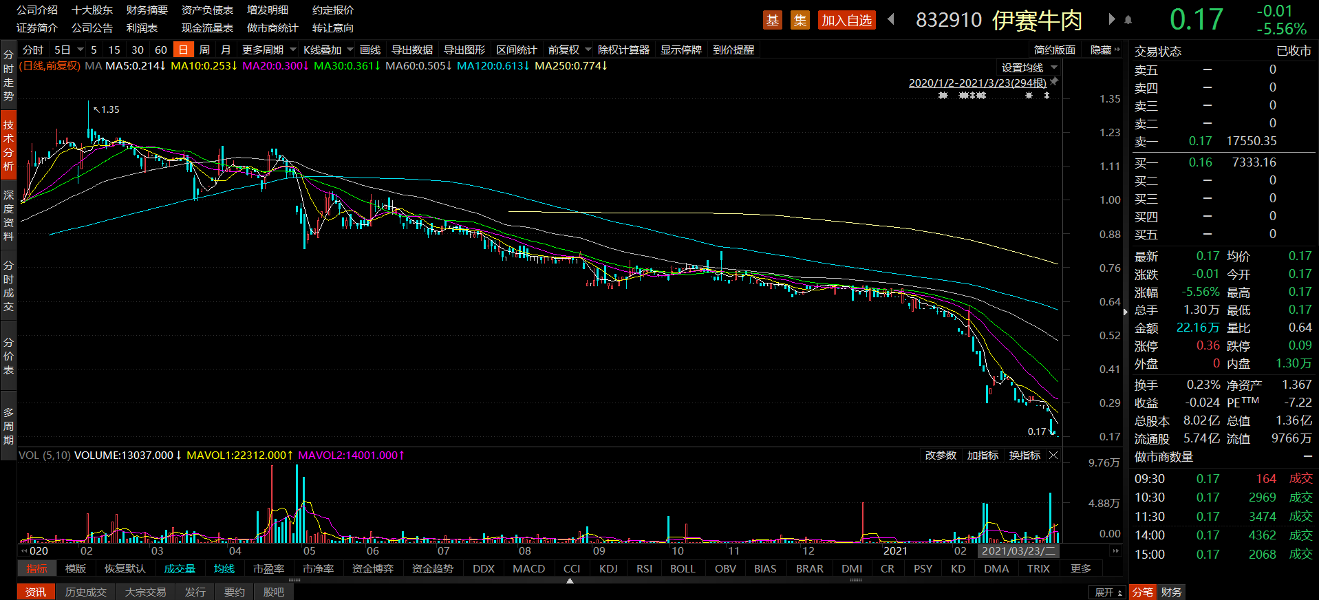 3月23日,伊赛牛肉开盘即跌停,截至收盘股价0.17元/股,跌入了近两年最低谷,总市值1.36亿元。