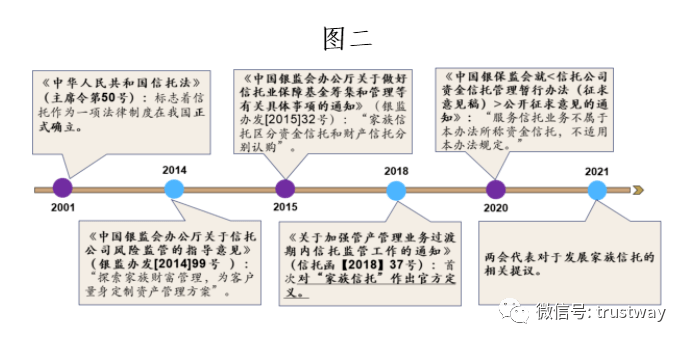 从法律法规角度,境内家族信托相关法律法规不断完善(如图二),同时《民法典》的出台对家族信托涉及的诸多法律关系进行了明确,一方面意味着境内家族信托有法可依、规范发展,另一方面代表了监管对大力发展家族信托业务的鼓励。