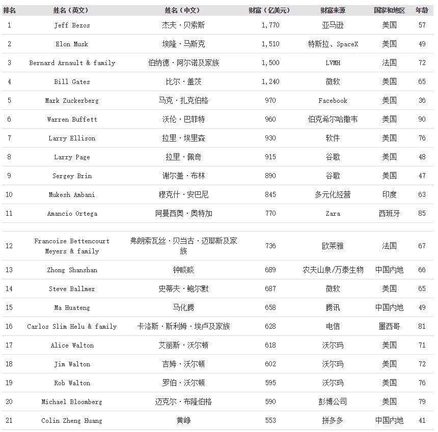 去年风头强劲的特斯拉老板埃隆·马斯克从去年的第31位飙升至第2位,个人财富为1510亿美元。轩尼诗-路易·威登集团的伯纳德•阿尔诺排在第3位,个人财富为1500亿美元,跟马斯克非常接近。